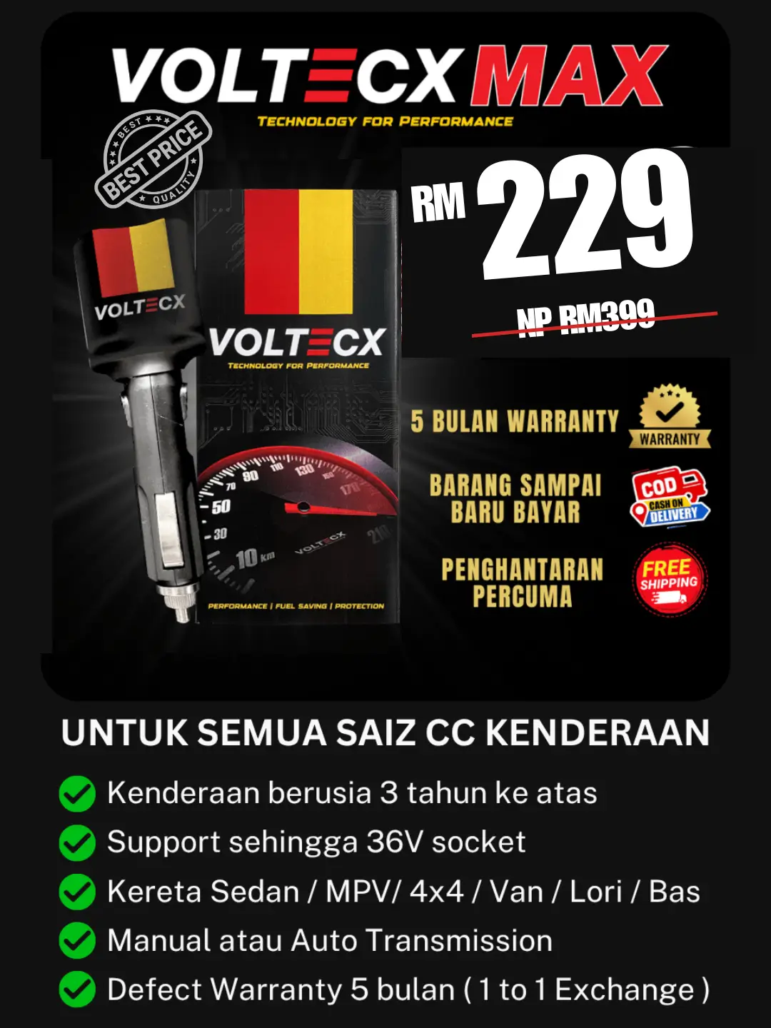 VoltecX sesuai digunakan untuk semua jenis kenderaan yang mempunyai soket pencucuh rokok.